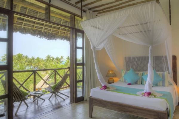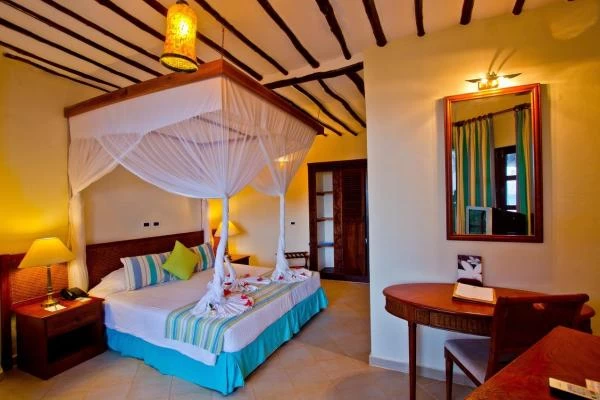 Each air-conditioned accommodation is decorated with Zanzibar furniture. There is a seating area with flat-screen satellite TV, minibar and private bathroom. Some huts are located at the oceans edge.